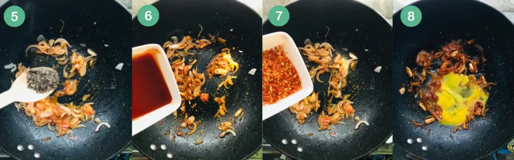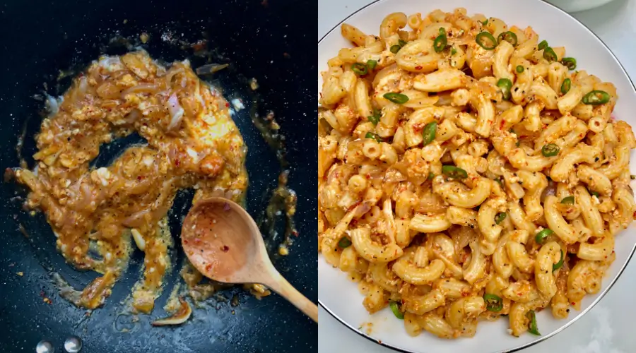 1. Once the pasta starts cooking, add olive oil to the pot over medium heat. Now, add garlic and red onions and stir them for 10 seconds. Once they turn light golden, add butter to the pot. Once it melts, add the tomato paste (or purée), pepper, and chili flakes, stirring consistently. Then, turn off the stove or lower it and add eggs while mixing the combo. Do not take so long to add the drained pasta after adding eggs (Check out the above step-by-step guidance with photos for a clear idea.