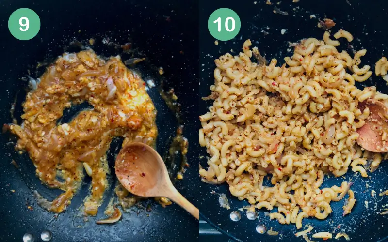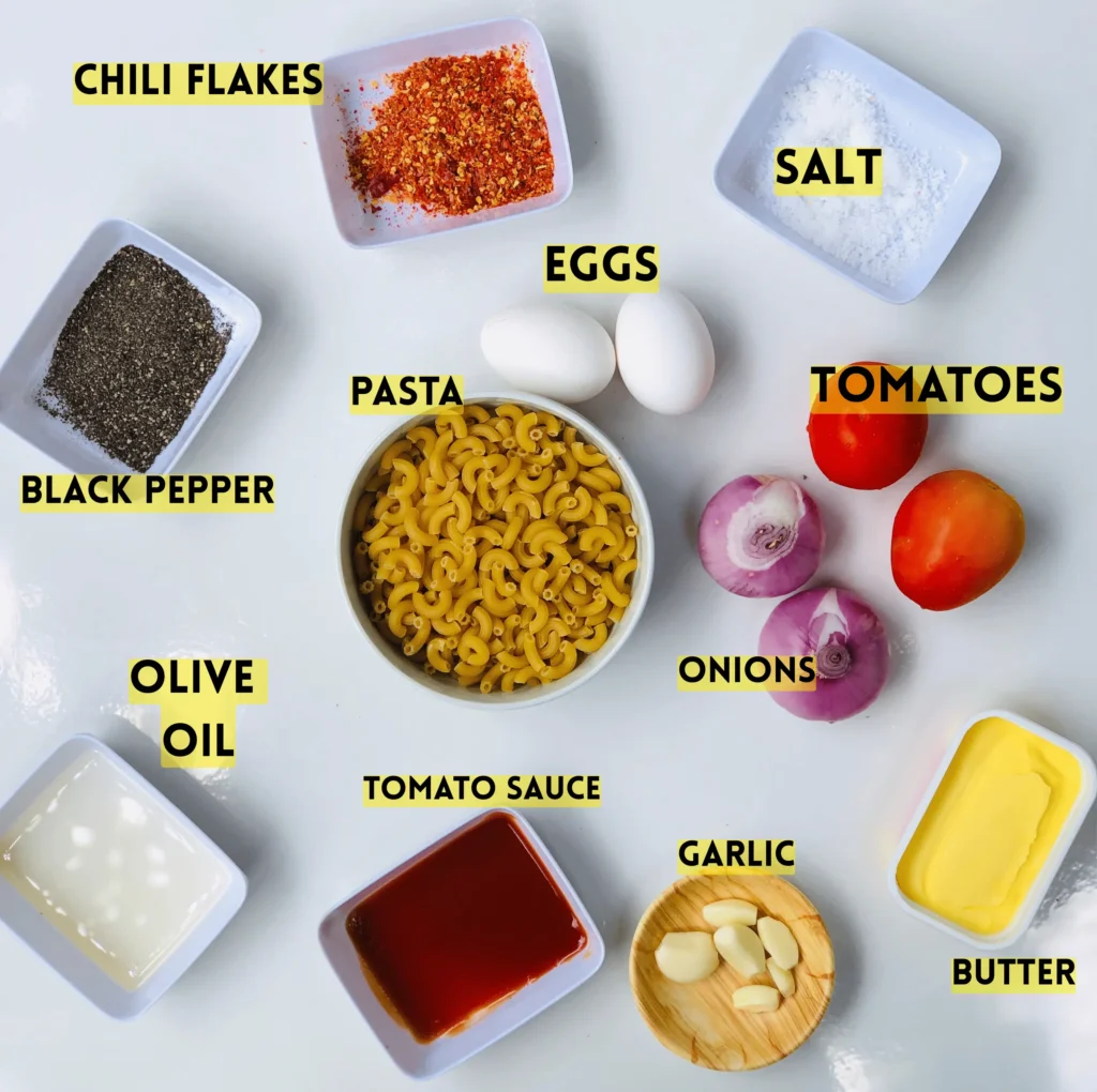 Pasta: Choosing the pasta type is really up to you. You can use any kind of short pasta like macaroni, penne, or whatever in this recipe. I’ve used macaroni here because that curved tube shape captures egg-tomato paste well and is easy to eat.