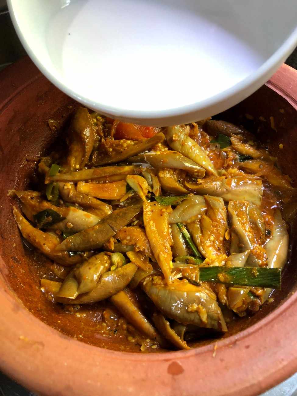 Controlling the heat: once you place the clay pot on the stove, remember to keep cooking on low-medium heat. Do not continue cooking on high heat, as it may cause quick browning, scorching and thicken the eggplants.