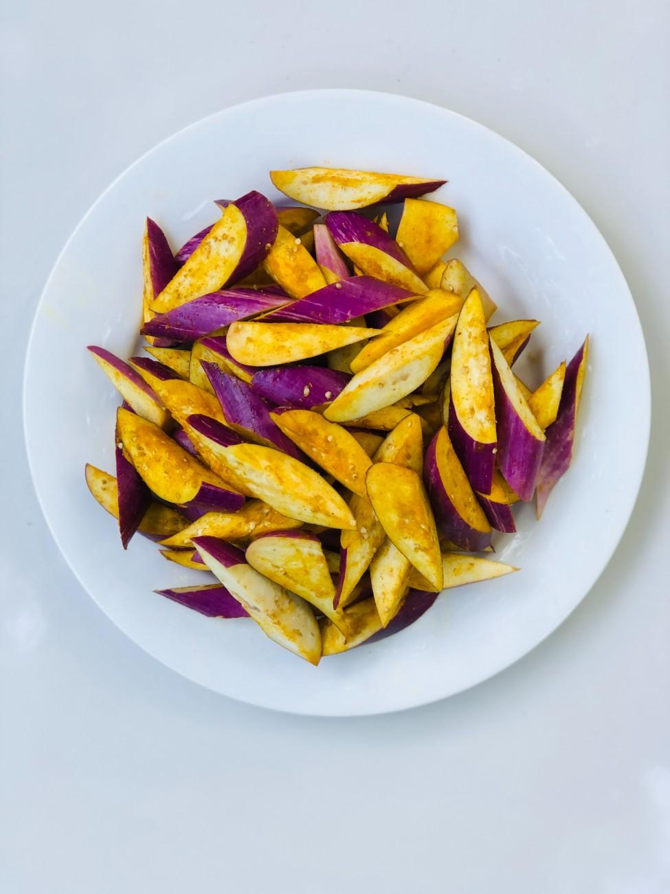 After cutting, sprinkle some turmeric powder immediately and mix them well to avoid turning the pieces brown